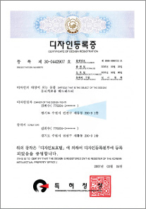 Invention Patent Registration No. 0719661 / Pct International Patent Kr2009/007516 / International Patent Application 0001296 / Pct International Patent Application Kr2011 / Us Application: 13/577,142 / China Application: 201190000365.4 / Japanese Application: 2012-600066 / Trademark Registration No. 0744664 / Trademark Registration No. 40-2009-0062881 / Design Registration No. 0442907 / Design Registration No. 0570731 / Design Registration No. 30-0546912 / Design Registration No. 30-2009-0054696 / Design Application No. 30,030,905
